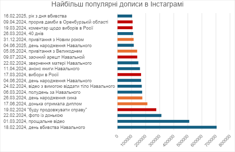 There are many posts in 2024, and they are initially popular. For example, in the days immediately following the murder: posts dated February 19-22, the farewell post on March 1, the “Noon Against Putin” campaign, 40 days after Navalny’s death, and all the others mentioned above. Compared to 2024, the average post in 2025 receives a little over three thousand likes, comments, and reposts.