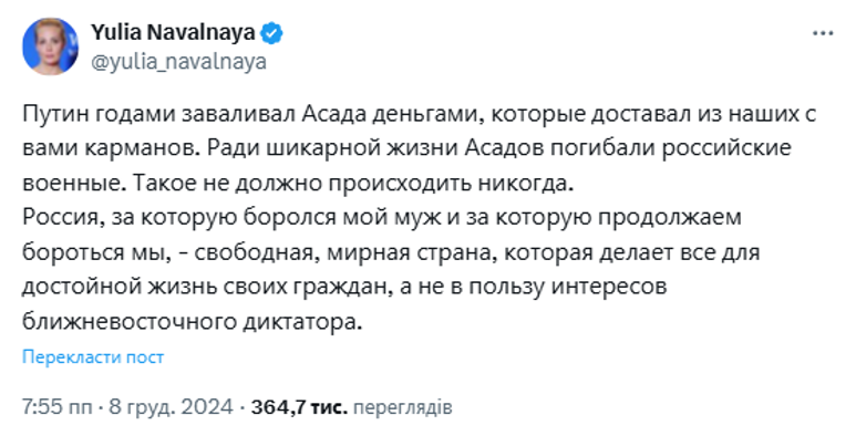 Below is her post about the fall of the Assad regime in Syria: “For years, Putin showered Assad with money that he took from our pockets. Russian soldiers died for the sake of the Assads’ luxurious lifestyle.”