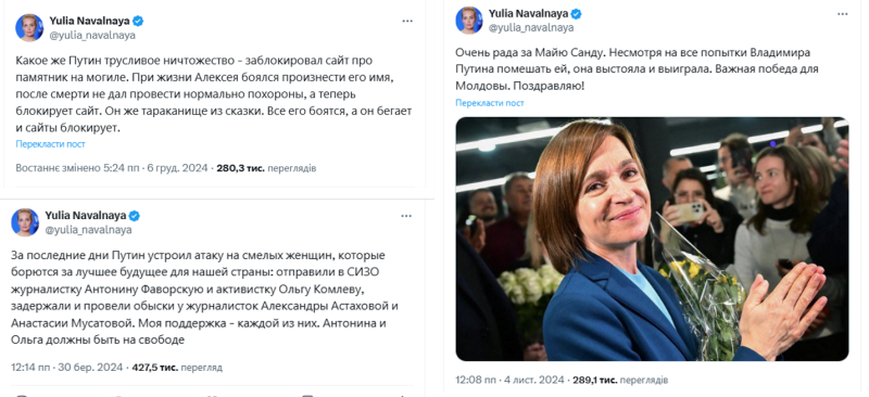 Now, let’s take a closer look at Navalnaya’s posts. We will focus on her posts on X because political topics are discussed more frequently there than on Instagram. Often, the posts themselves are duplicates.