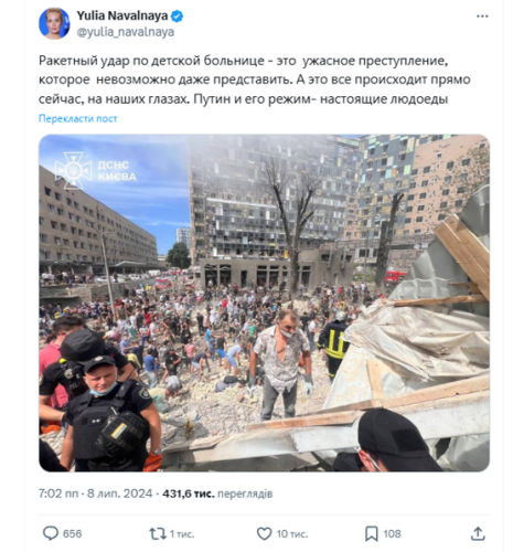 For example, Navalnaya writes about the missile strike on the Okhmatdyt hospital. She calls it a “horrific crime that is impossible to even imagine.” Those responsible are “Putin and his regime.” However, there is no mention of the Russians who carried out the strike.