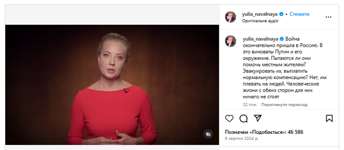 Of course, the war in Ukraine is only Putin and his “entourage,” not Russian society. In this narrative, Navalnaya emphasizes that Putin and the Russian people must be distinguished from one another because, in her opinion, “the real Russia” is “against the war.” In a post reacting to events in Kursk, Navalnaya writes: