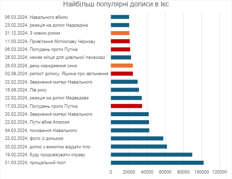 The situation on the social network X is very similar. Most of the popular posts were created in February and March 2024, shortly after Alexei Navalny’s murder. Political posts include calls to join the aforementioned “Noon Against Putin” campaign, photos from the event, and reposts of photos of Russian political prisoners after their release. There are also congratulations to Ukrainian director Mstyslav Chernov on winning an Oscar. Personal posts are the same as on Instagram.